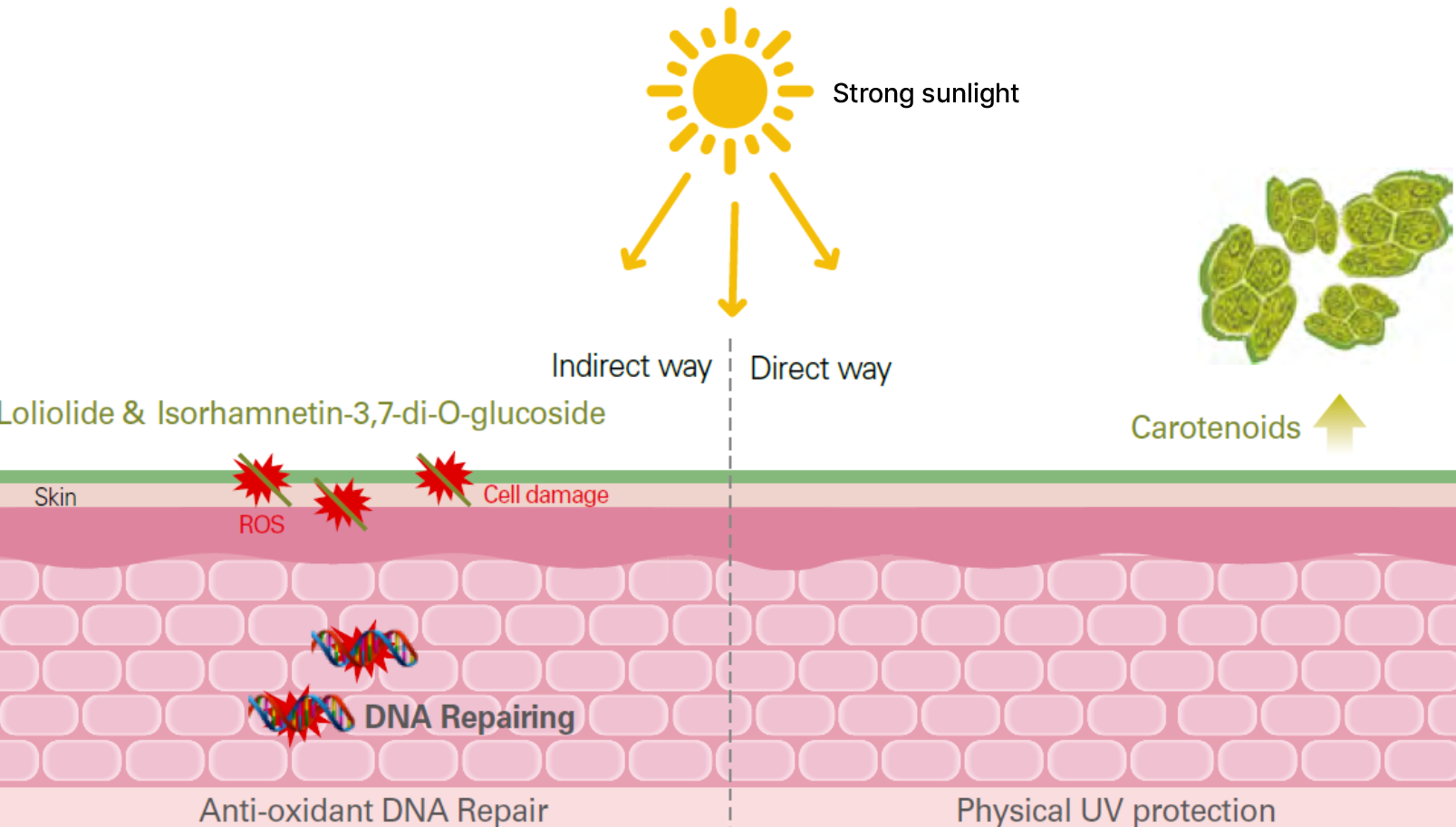 Desertica provides dual protection for the skin even under intense UV exposure. Its antioxidant actives help repair DNA damaged by ROS, while carotenoids derived from microalgae directly block UV rays to safeguard the skin’s structure.